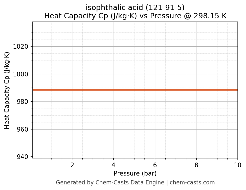 This page presents the pressure-dependent thermodynamic and transport properties of isophthalic acid (CAS 121-91-5) calculated at a constant temperature of 298 K (25 °C) over the pressure range 0.10-10 bar.