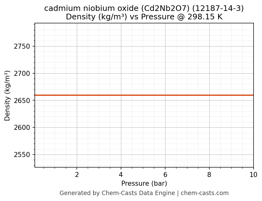 This page presents the pressure-dependent thermodynamic and transport properties of cadmium niobium oxide (Cd2Nb2O7) (CAS 12187-14-3) calculated at a constant temperature of 298 K (25 °C) over the pressure range 0.10-10 bar.