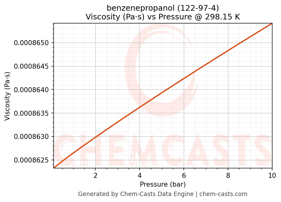 This page presents the pressure-dependent thermodynamic and transport properties of benzenepropanol (CAS 122-97-4) calculated at a constant temperature of 298 K (25 °C) over the pressure range 0.10-10 bar.