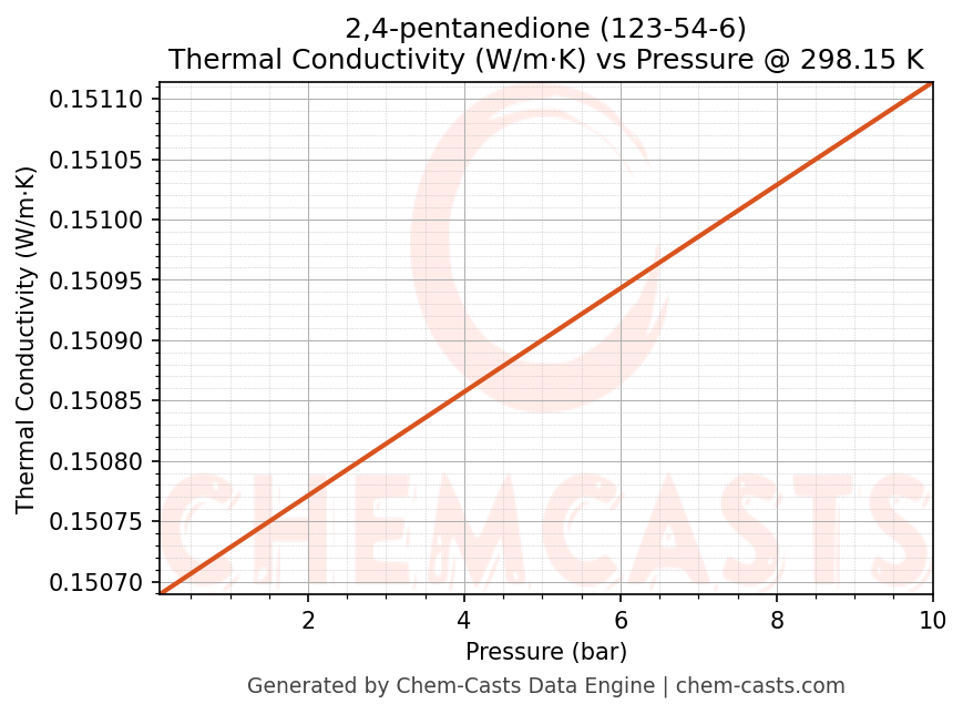 This page presents the pressure-dependent thermodynamic and transport properties of 2,4-pentanedione (CAS 123-54-6) calculated at a constant temperature of 298 K (25 °C) over the pressure range 0.10-10 bar.