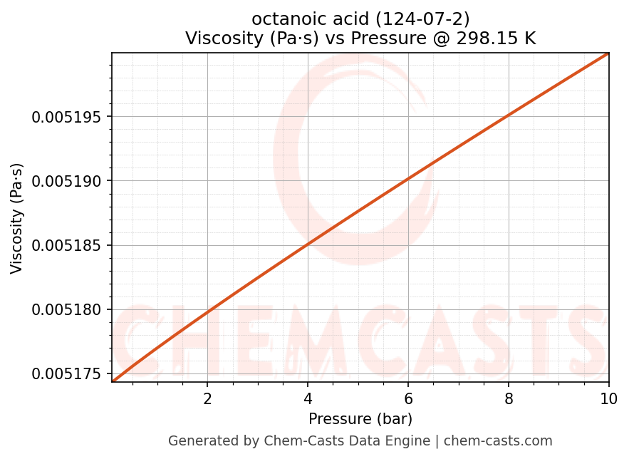 This page presents the pressure-dependent thermodynamic and transport properties of octanoic acid (CAS 124-07-2) calculated at a constant temperature of 298 K (25 °C) over the pressure range 0.10-10 bar.