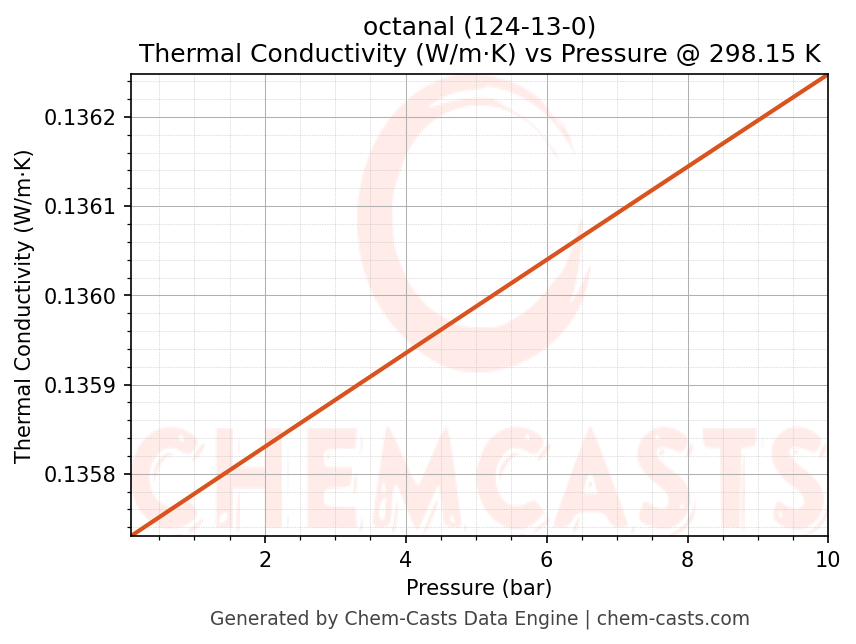 This page presents the pressure-dependent thermodynamic and transport properties of octanal (CAS 124-13-0) calculated at a constant temperature of 298 K (25 °C) over the pressure range 0.10-10 bar.