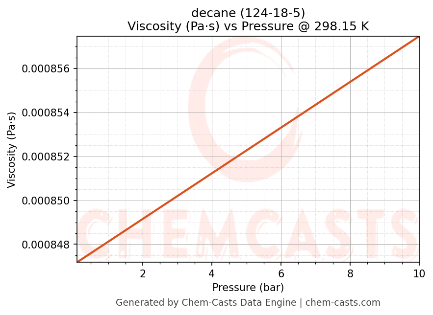This page presents the pressure-dependent thermodynamic and transport properties of decane (CAS 124-18-5) calculated at a constant temperature of 298 K (25 °C) over the pressure range 0.10-10 bar.