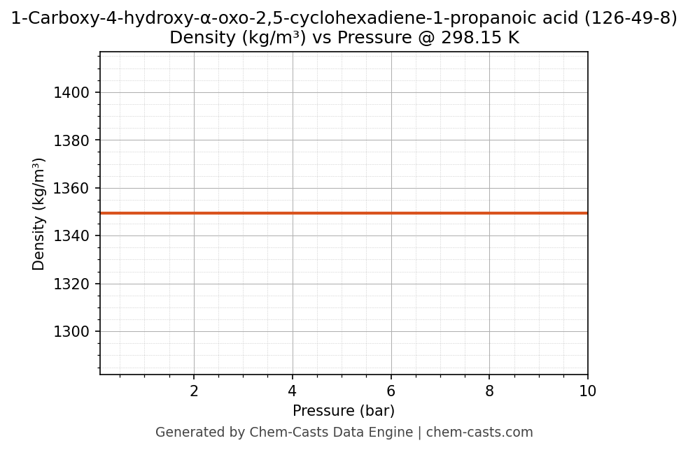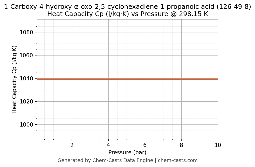 This page presents the pressure-dependent thermodynamic and transport properties of 1-Carboxy-4-hydroxy-α-oxo-2,5-cyclohexadiene-1-propanoic acid (CAS 126-49-8) calculated at a constant temperature of 298 K (25 °C) over the pressure range 0.10-10 bar.