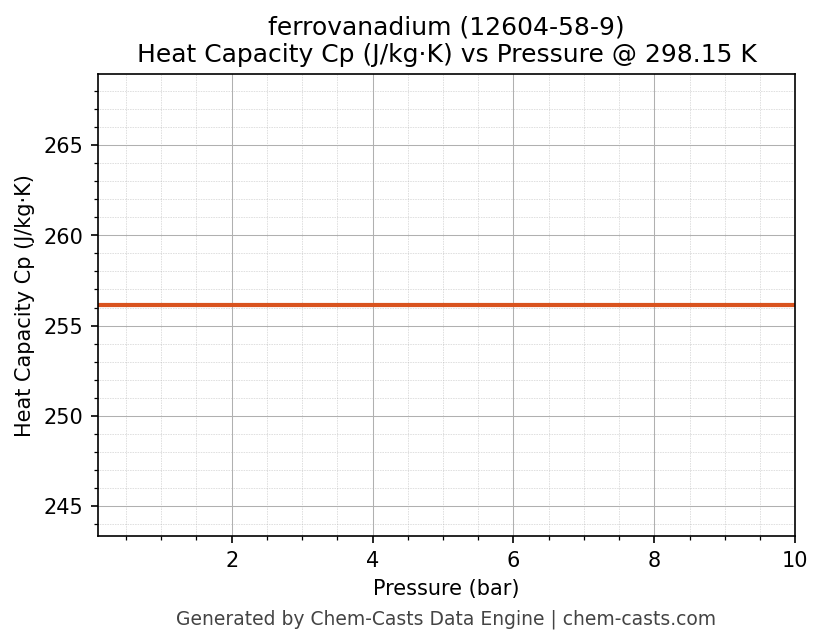 This page presents the pressure-dependent thermodynamic and transport properties of ferrovanadium (CAS 12604-58-9) calculated at a constant temperature of 298 K (25 °C) over the pressure range 0.10-10 bar.