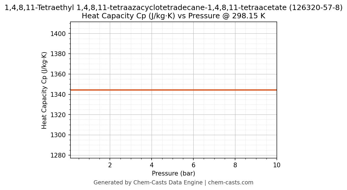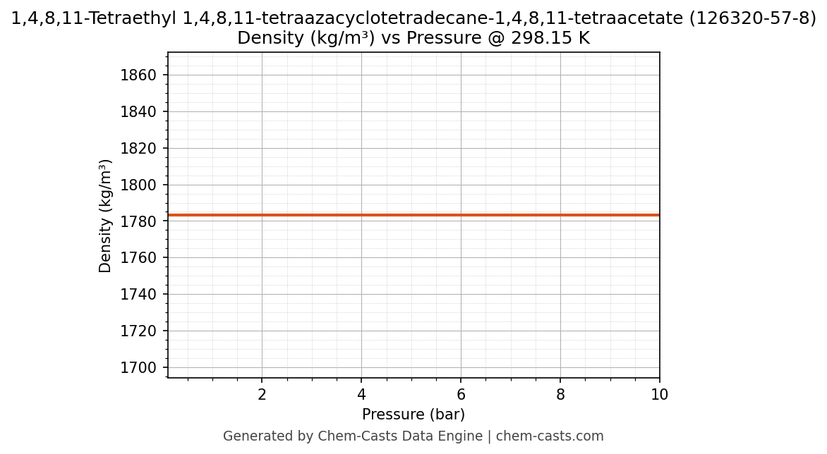This page presents the pressure-dependent thermodynamic and transport properties of 1,4,8,11-Tetraethyl 1,4,8,11-tetraazacyclotetradecane-1,4,8,11-tetraacetate (CAS 126320-57-8) calculated at a constant temperature of 298 K (25 °C) over the pressure range 0.10-10 bar.
