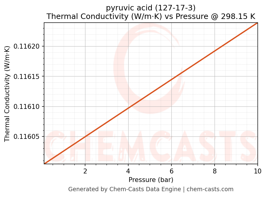 This page presents the pressure-dependent thermodynamic and transport properties of pyruvic acid (CAS 127-17-3) calculated at a constant temperature of 298 K (25 °C) over the pressure range 0.10-10 bar.