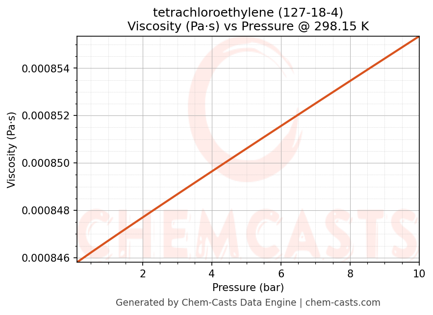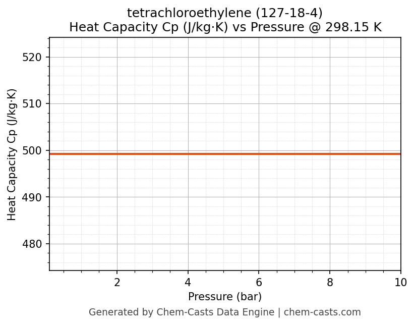 This page presents the pressure-dependent thermodynamic and transport properties of tetrachloroethylene (CAS 127-18-4) calculated at a constant temperature of 298 K (25 °C) over the pressure range 0.10-10 bar.
