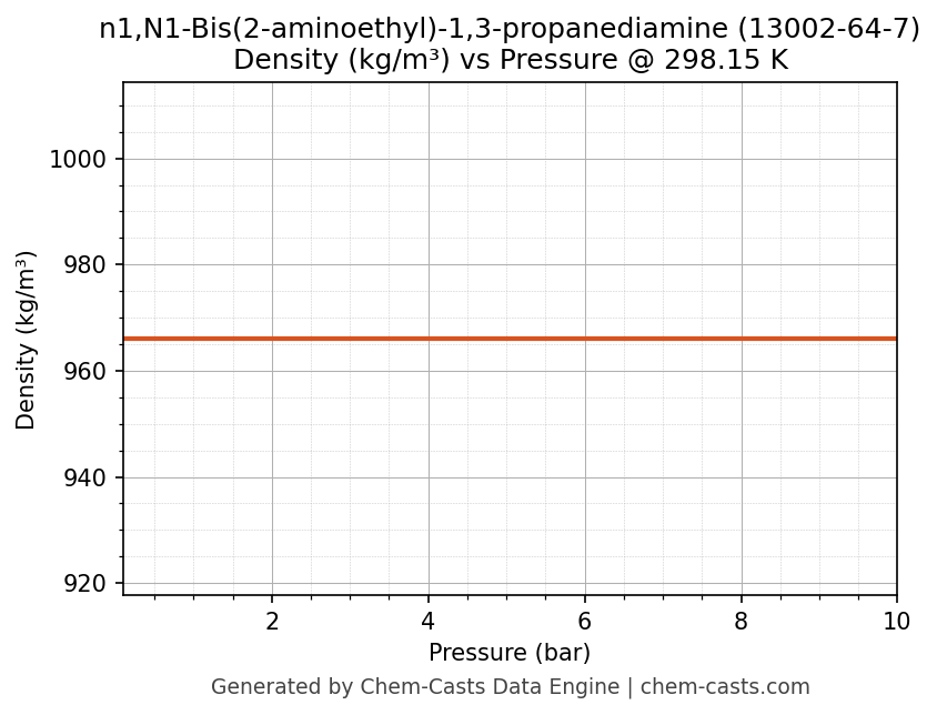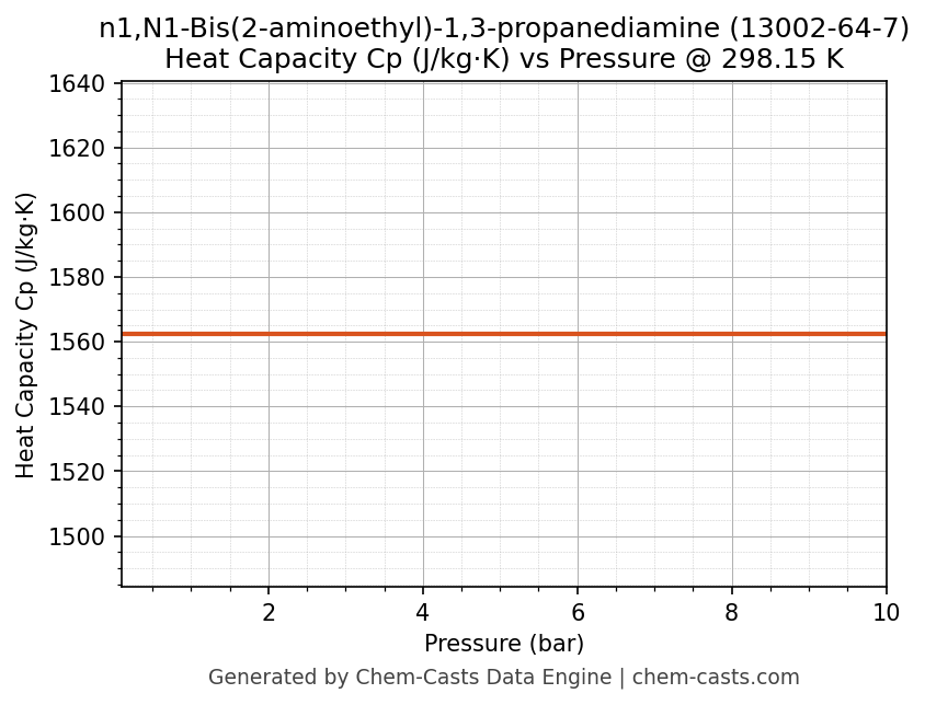 This page presents the pressure-dependent thermodynamic and transport properties of n1,N1-Bis(2-aminoethyl)-1,3-propanediamine (CAS 13002-64-7) calculated at a constant temperature of 298 K (25 °C) over the pressure range 0.10-10 bar.
