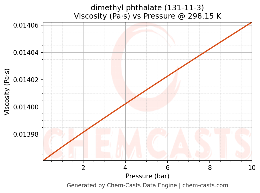 This page presents the pressure-dependent thermodynamic and transport properties of dimethyl phthalate (CAS 131-11-3) calculated at a constant temperature of 298 K (25 °C) over the pressure range 0.10-10 bar.