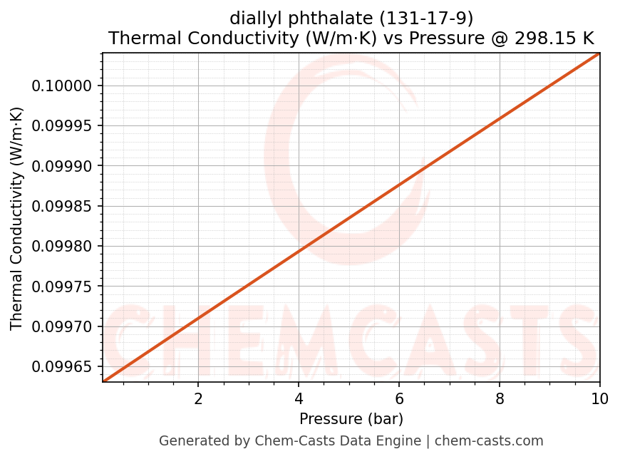 This page presents the pressure-dependent thermodynamic and transport properties of diallyl phthalate (CAS 131-17-9) calculated at a constant temperature of 298 K (25 °C) over the pressure range 0.10-10 bar.