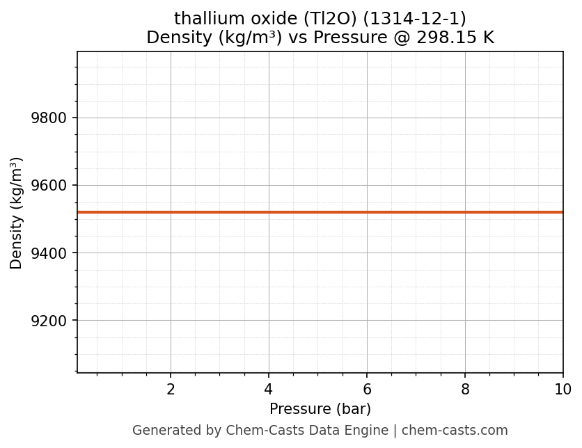 This page presents the pressure-dependent thermodynamic and transport properties of thallium oxide (Tl2O) (CAS 1314-12-1) calculated at a constant temperature of 298 K (25 °C) over the pressure range 0.10-10 bar.
