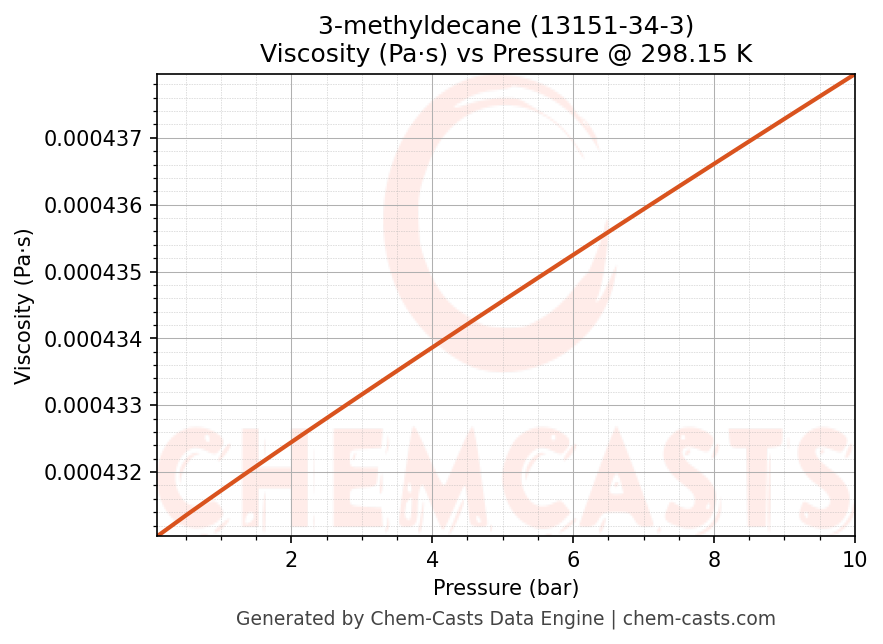 This page presents the pressure-dependent thermodynamic and transport properties of 3-methyldecane (CAS 13151-34-3) calculated at a constant temperature of 298 K (25 °C) over the pressure range 0.10-10 bar.
