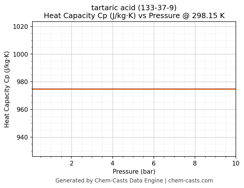 This page presents the pressure-dependent thermodynamic and transport properties of tartaric acid (CAS 133-37-9) calculated at a constant temperature of 298 K (25 °C) over the pressure range 0.10-10 bar.