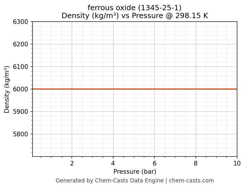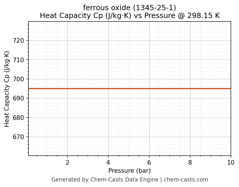 This page presents the pressure-dependent thermodynamic and transport properties of ferrous oxide (CAS 1345-25-1) calculated at a constant temperature of 298 K (25 °C) over the pressure range 0.10-10 bar.