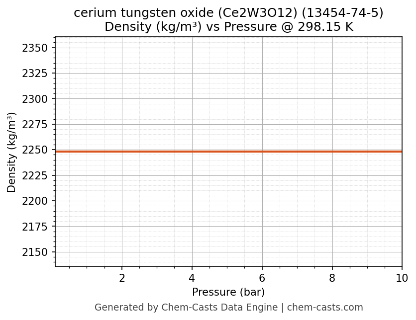 This page presents the pressure-dependent thermodynamic and transport properties of cerium tungsten oxide (Ce2W3O12) (CAS 13454-74-5) calculated at a constant temperature of 298 K (25 °C) over the pressure range 0.10-10 bar.