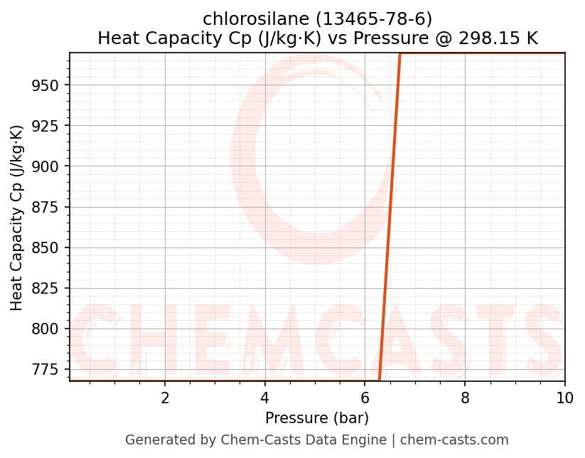 This page presents the pressure-dependent thermodynamic and transport properties of chlorosilane (CAS 13465-78-6) calculated at a constant temperature of 298 K (25 °C) over the pressure range 0.10-10 bar.