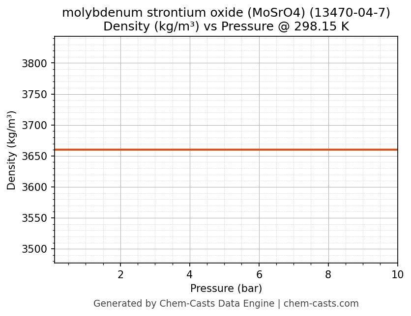 This page presents the pressure-dependent thermodynamic and transport properties of molybdenum strontium oxide (MoSrO4) (CAS 13470-04-7) calculated at a constant temperature of 298 K (25 °C) over the pressure range 0.10-10 bar.