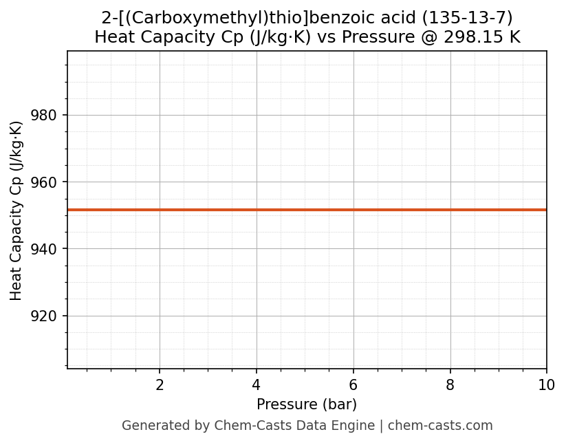 This page presents the pressure-dependent thermodynamic and transport properties of 2-[(Carboxymethyl)thio]benzoic acid (CAS 135-13-7) calculated at a constant temperature of 298 K (25 °C) over the pressure range 0.10-10 bar.