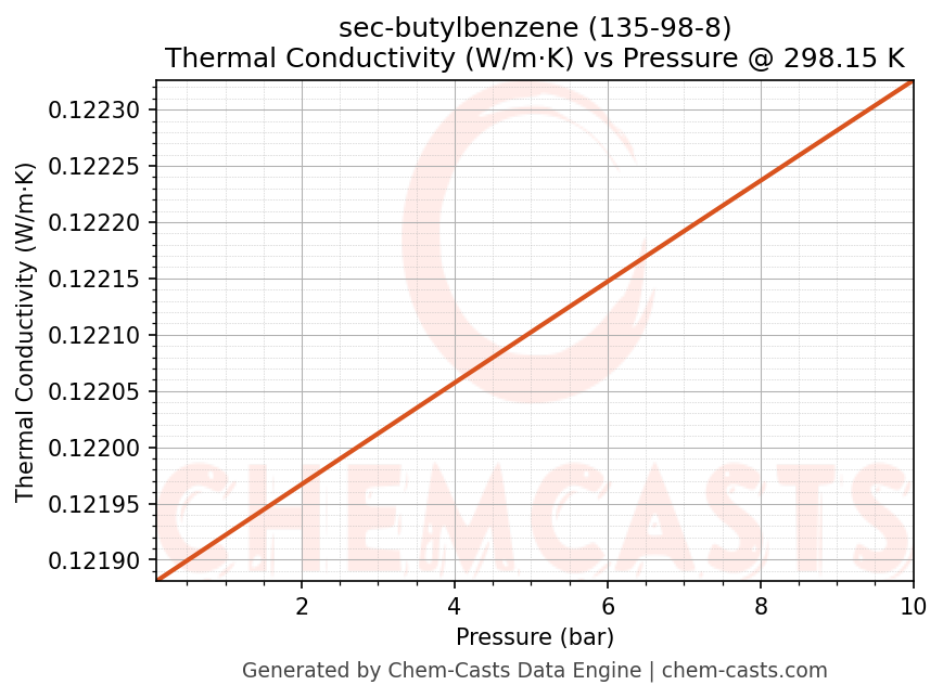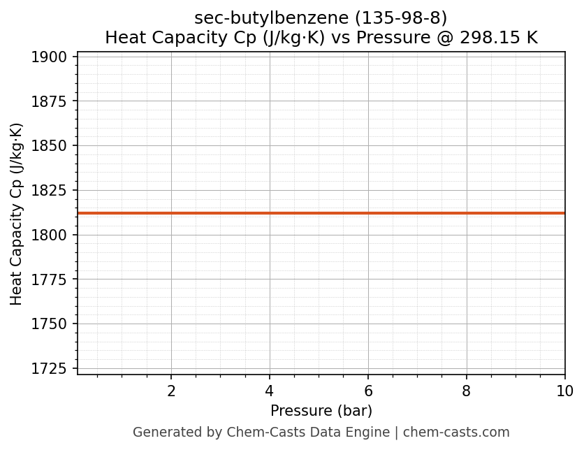 This page presents the pressure-dependent thermodynamic and transport properties of sec-butylbenzene (CAS 135-98-8) calculated at a constant temperature of 298 K (25 °C) over the pressure range 0.10-10 bar.