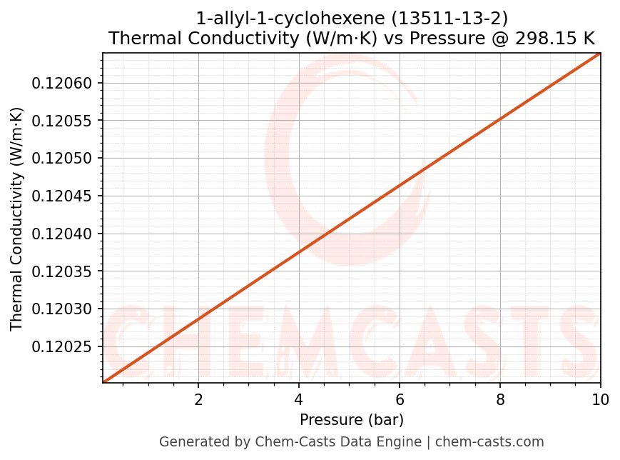 This page presents the pressure-dependent thermodynamic and transport properties of 1-allyl-1-cyclohexene (CAS 13511-13-2) calculated at a constant temperature of 298 K (25 °C) over the pressure range 0.10-10 bar.
