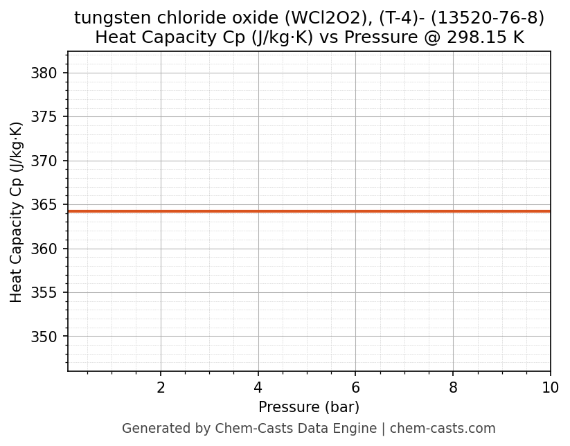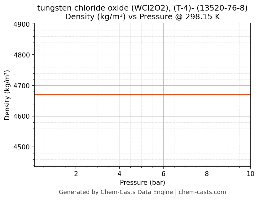 This page presents the pressure-dependent thermodynamic and transport properties of tungsten chloride oxide (WCl2O2), (T-4)- (CAS 13520-76-8) calculated at a constant temperature of 298 K (25 °C) over the pressure range 0.10-10 bar.