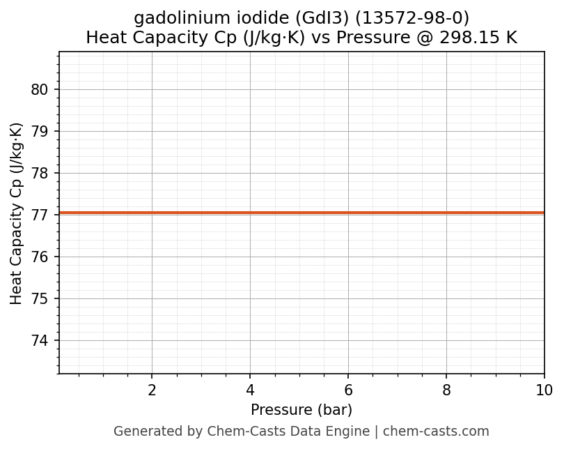 This page presents the pressure-dependent thermodynamic and transport properties of gadolinium iodide (GdI3) (CAS 13572-98-0) calculated at a constant temperature of 298 K (25 °C) over the pressure range 0.10-10 bar.