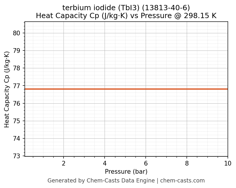 This page presents the pressure-dependent thermodynamic and transport properties of terbium iodide (TbI3) (CAS 13813-40-6) calculated at a constant temperature of 298 K (25 °C) over the pressure range 0.10-10 bar.