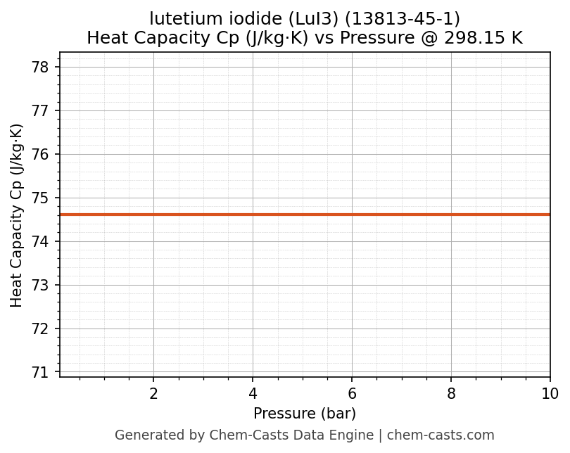 This page presents the pressure-dependent thermodynamic and transport properties of lutetium iodide (LuI3) (CAS 13813-45-1) calculated at a constant temperature of 298 K (25 °C) over the pressure range 0.10-10 bar.