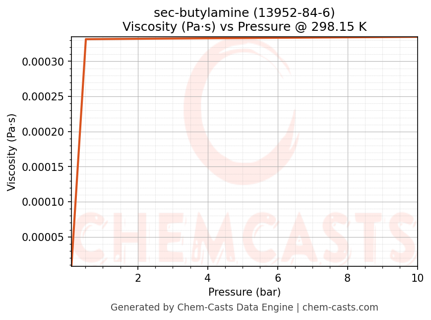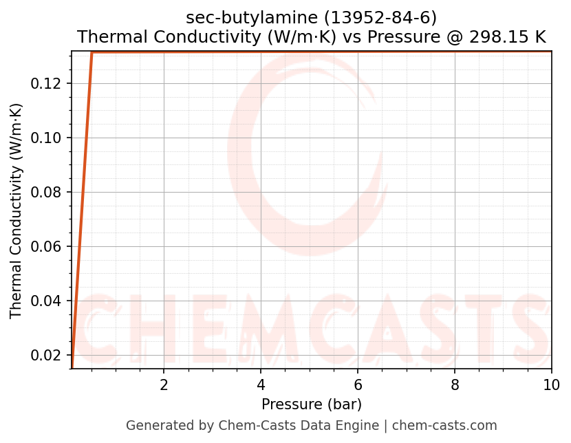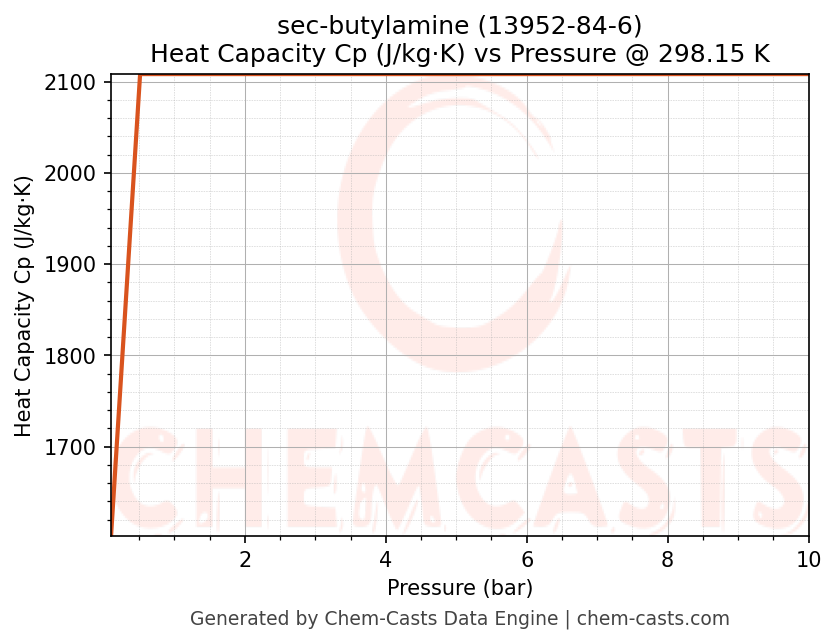 This page presents the pressure-dependent thermodynamic and transport properties of sec-butylamine (CAS 13952-84-6) calculated at a constant temperature of 298 K (25 °C) over the pressure range 0.10-10 bar.