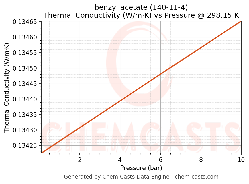 This page presents the pressure-dependent thermodynamic and transport properties of benzyl acetate (CAS 140-11-4) calculated at a constant temperature of 298 K (25 °C) over the pressure range 0.10-10 bar.