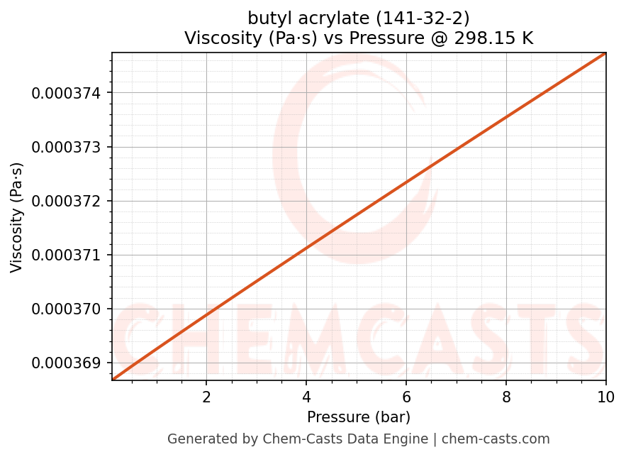 This page presents the pressure-dependent thermodynamic and transport properties of butyl acrylate (CAS 141-32-2) calculated at a constant temperature of 298 K (25 °C) over the pressure range 0.10-10 bar.