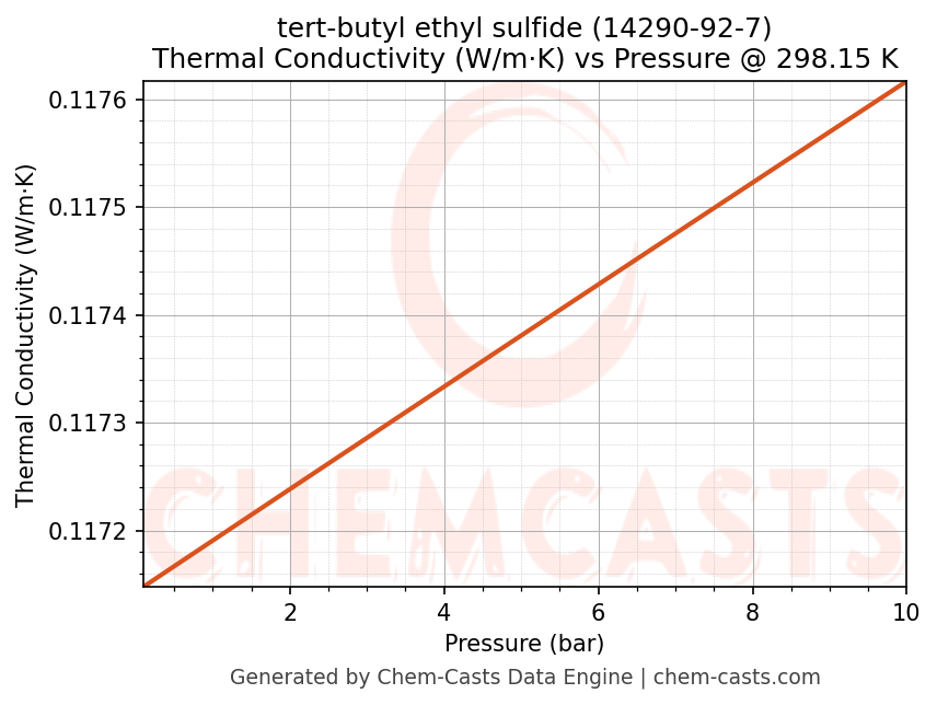 This page presents the pressure-dependent thermodynamic and transport properties of tert-butyl ethyl sulfide (CAS 14290-92-7) calculated at a constant temperature of 298 K (25 °C) over the pressure range 0.10-10 bar.