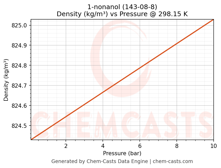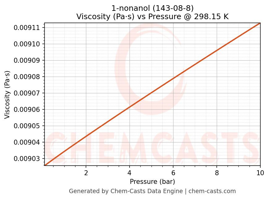 This page presents the pressure-dependent thermodynamic and transport properties of 1-nonanol (CAS 143-08-8) calculated at a constant temperature of 298 K (25 °C) over the pressure range 0.10-10 bar.