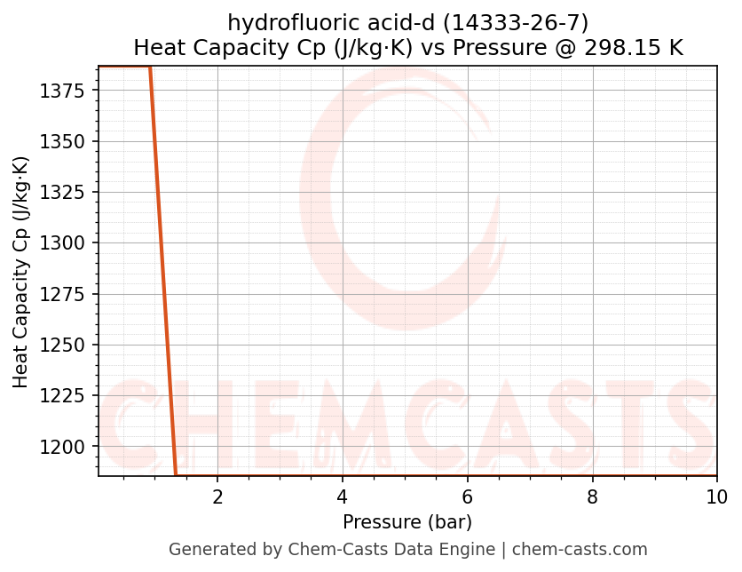 This page presents the pressure-dependent thermodynamic and transport properties of hydrofluoric acid-d (CAS 14333-26-7) calculated at a constant temperature of 298 K (25 °C) over the pressure range 0.10-10 bar.