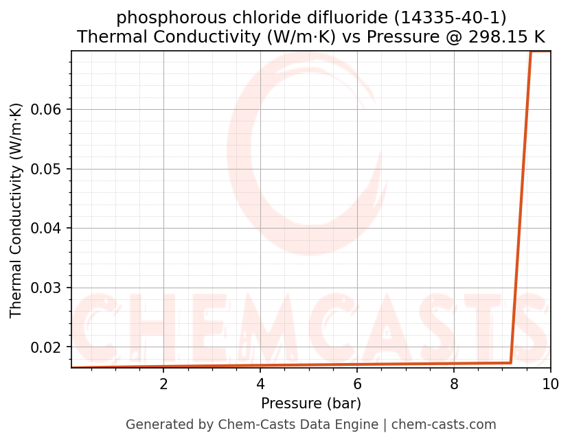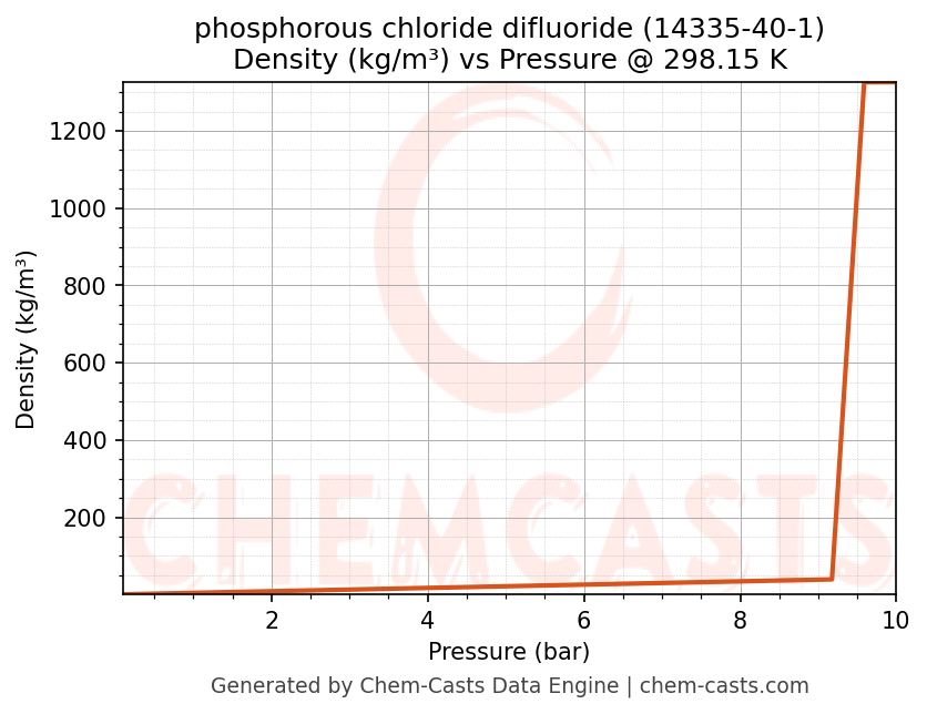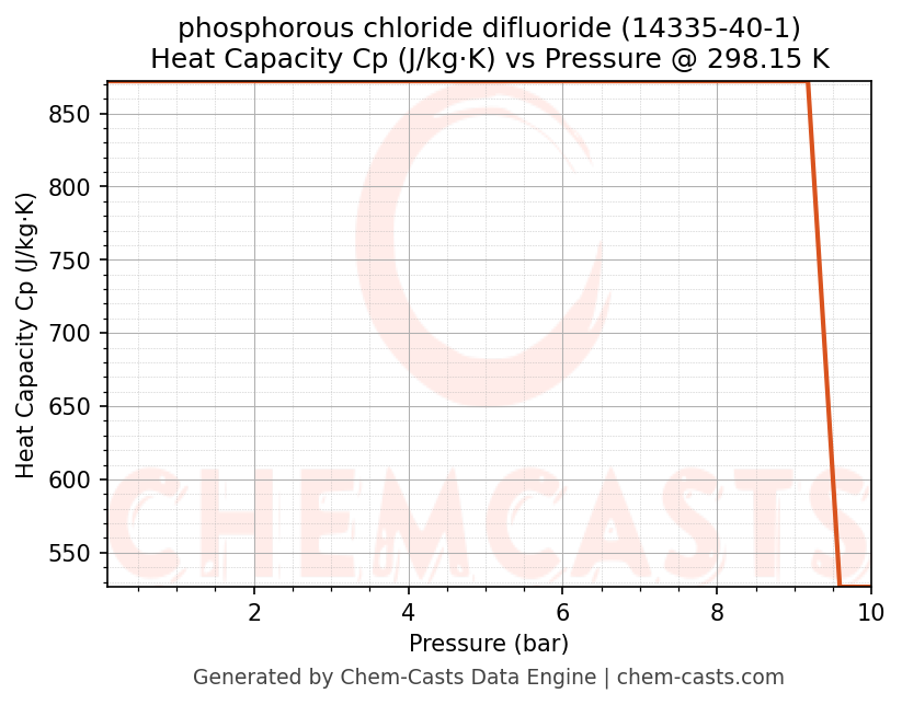 This page presents the pressure-dependent thermodynamic and transport properties of phosphorous chloride difluoride (CAS 14335-40-1) calculated at a constant temperature of 298 K (25 °C) over the pressure range 0.10-10 bar.