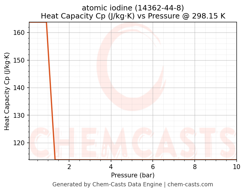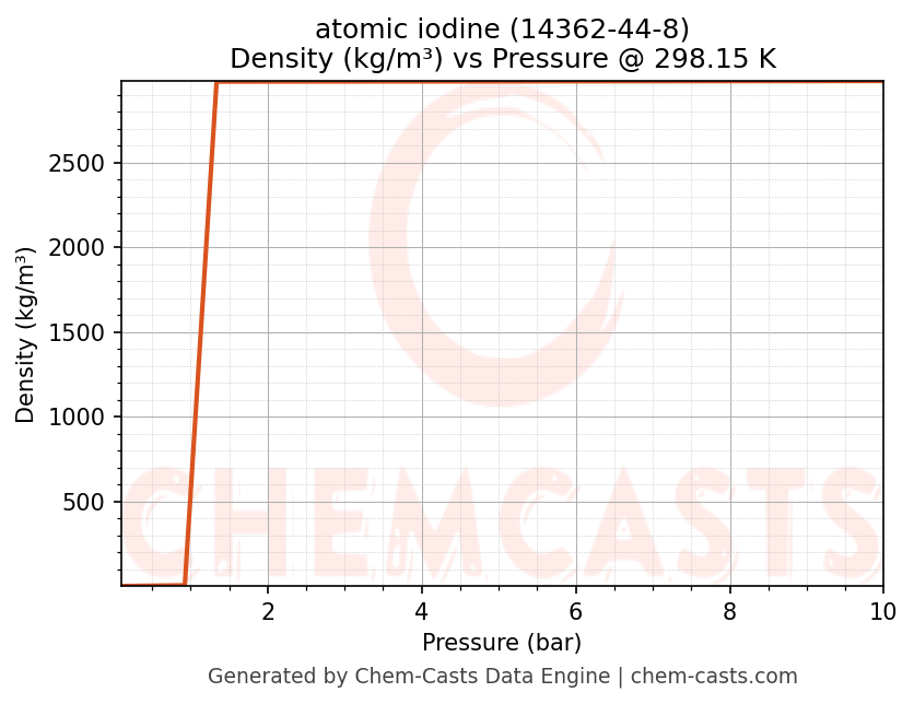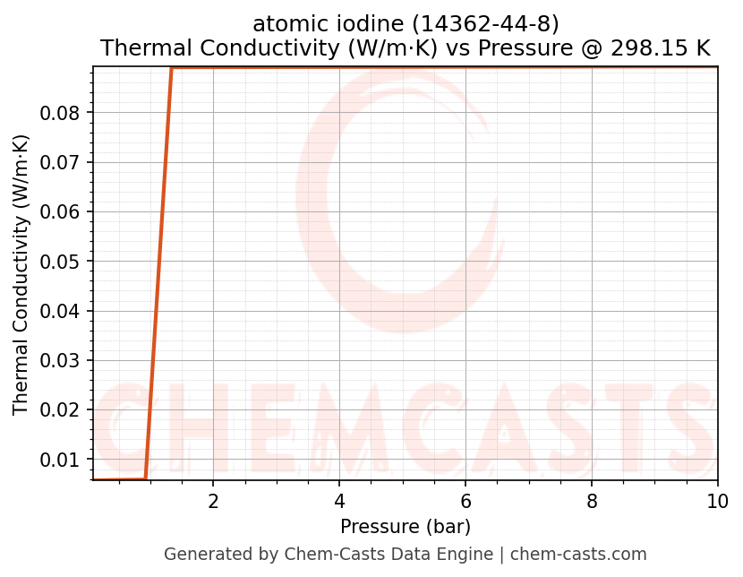 This page presents the pressure-dependent thermodynamic and transport properties of atomic iodine (CAS 14362-44-8) calculated at a constant temperature of 298 K (25 °C) over the pressure range 0.10-10 bar.