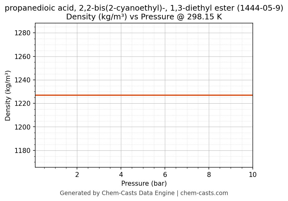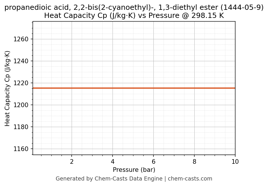 This page presents the pressure-dependent thermodynamic and transport properties of propanedioic acid, 2,2-bis(2-cyanoethyl)-, 1,3-diethyl ester (CAS 1444-05-9) calculated at a constant temperature of 298 K (25 °C) over the pressure range 0.10-10 bar.