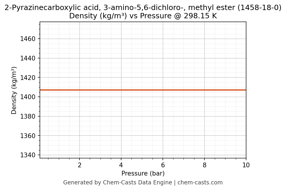 This page presents the pressure-dependent thermodynamic and transport properties of 2-Pyrazinecarboxylic acid, 3-amino-5,6-dichloro-, methyl ester (CAS 1458-18-0) calculated at a constant temperature of 298 K (25 °C) over the pressure range 0.10-10 bar.