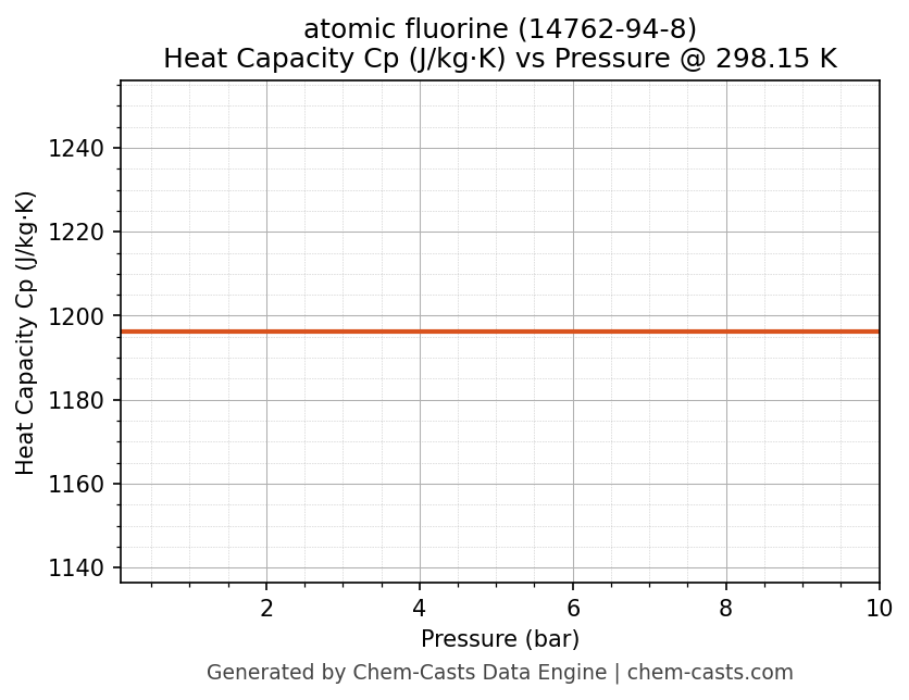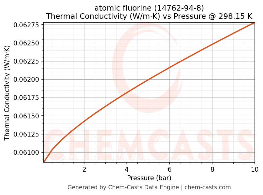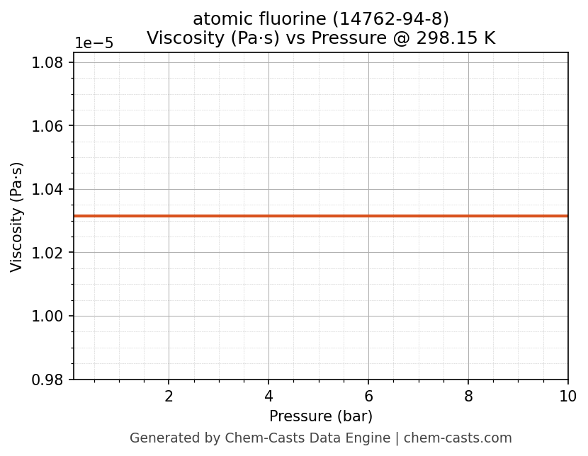 This page presents the pressure-dependent thermodynamic and transport properties of atomic fluorine (CAS 14762-94-8) calculated at a constant temperature of 298 K (25 °C) over the pressure range 0.10-10 bar.