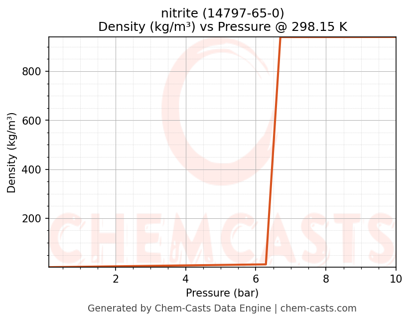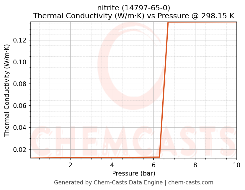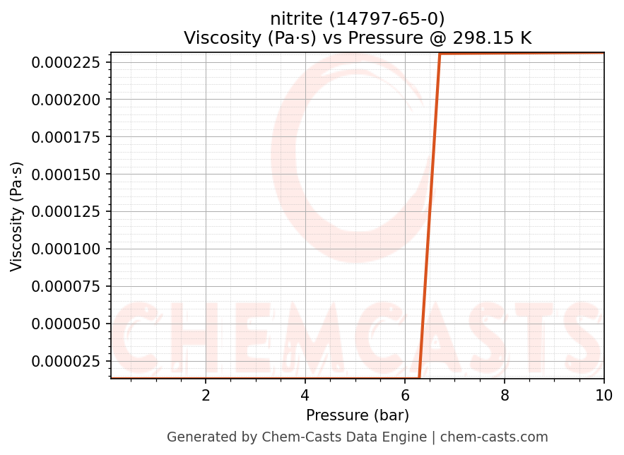 This page presents the pressure-dependent thermodynamic and transport properties of nitrite (CAS 14797-65-0) calculated at a constant temperature of 298 K (25 °C) over the pressure range 0.10-10 bar.