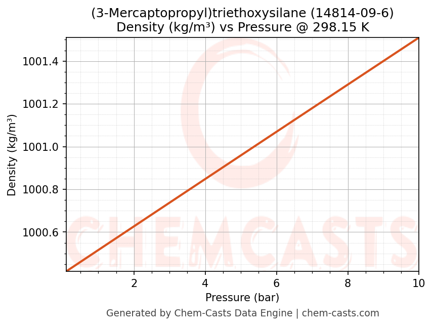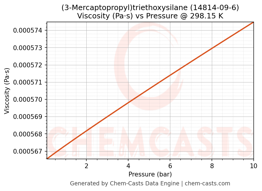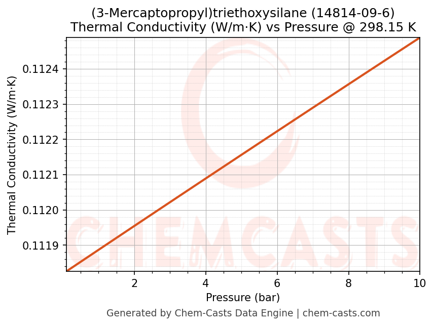 This page presents the pressure-dependent thermodynamic and transport properties of (3-Mercaptopropyl)triethoxysilane (CAS 14814-09-6) calculated at a constant temperature of 298 K (25 °C) over the pressure range 0.10-10 bar.