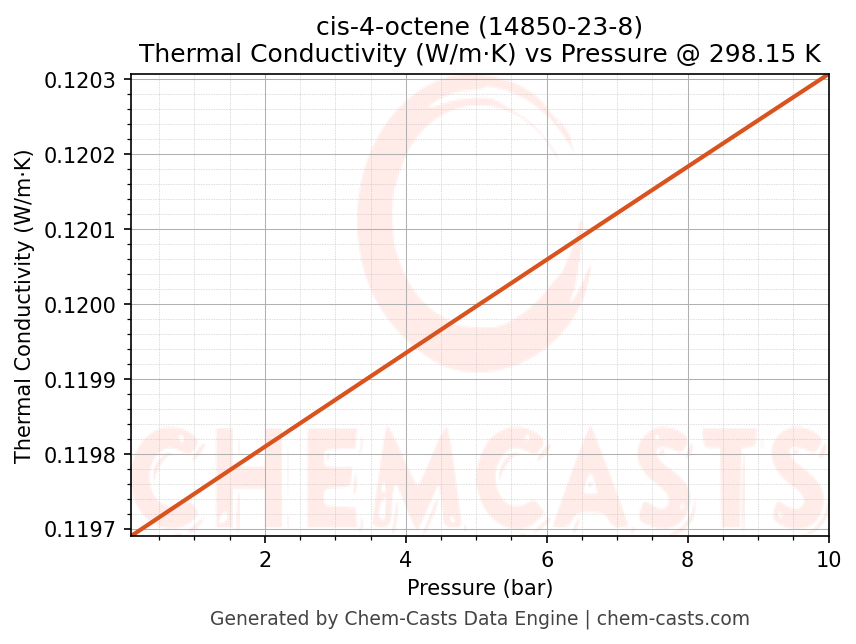 This page presents the pressure-dependent thermodynamic and transport properties of cis-4-octene (CAS 14850-23-8) calculated at a constant temperature of 298 K (25 °C) over the pressure range 0.10-10 bar.