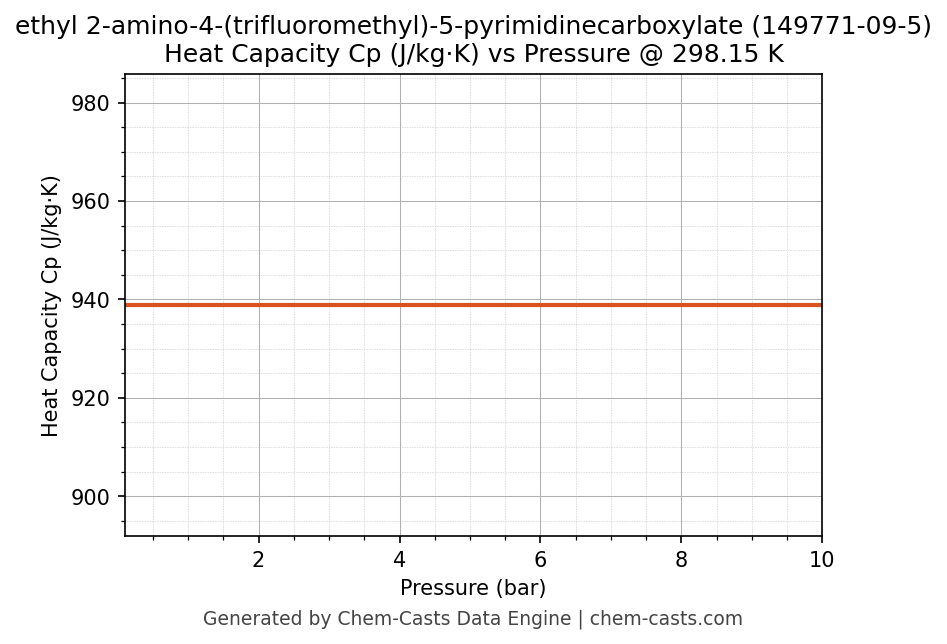 This page presents the pressure-dependent thermodynamic and transport properties of ethyl 2-amino-4-(trifluoromethyl)-5-pyrimidinecarboxylate (CAS 149771-09-5) calculated at a constant temperature of 298 K (25 °C) over the pressure range 0.10-10 bar.