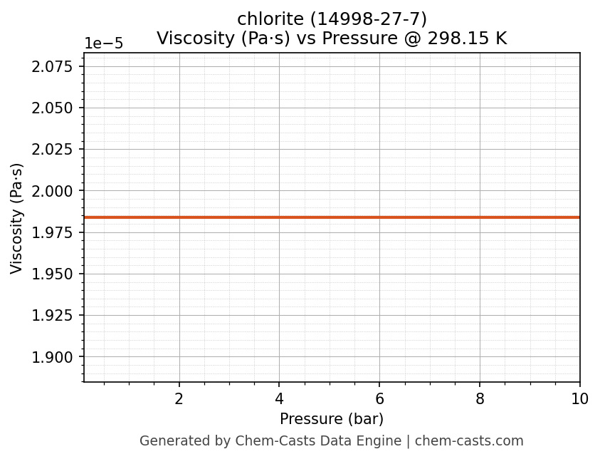 This page presents the pressure-dependent thermodynamic and transport properties of chlorite (CAS 14998-27-7) calculated at a constant temperature of 298 K (25 °C) over the pressure range 0.10-10 bar.