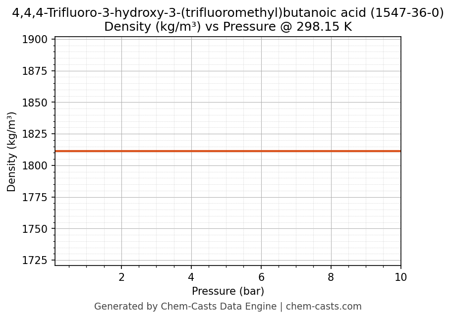 This page presents the pressure-dependent thermodynamic and transport properties of 4,4,4-Trifluoro-3-hydroxy-3-(trifluoromethyl)butanoic acid (CAS 1547-36-0) calculated at a constant temperature of 298 K (25 °C) over the pressure range 0.10-10 bar.