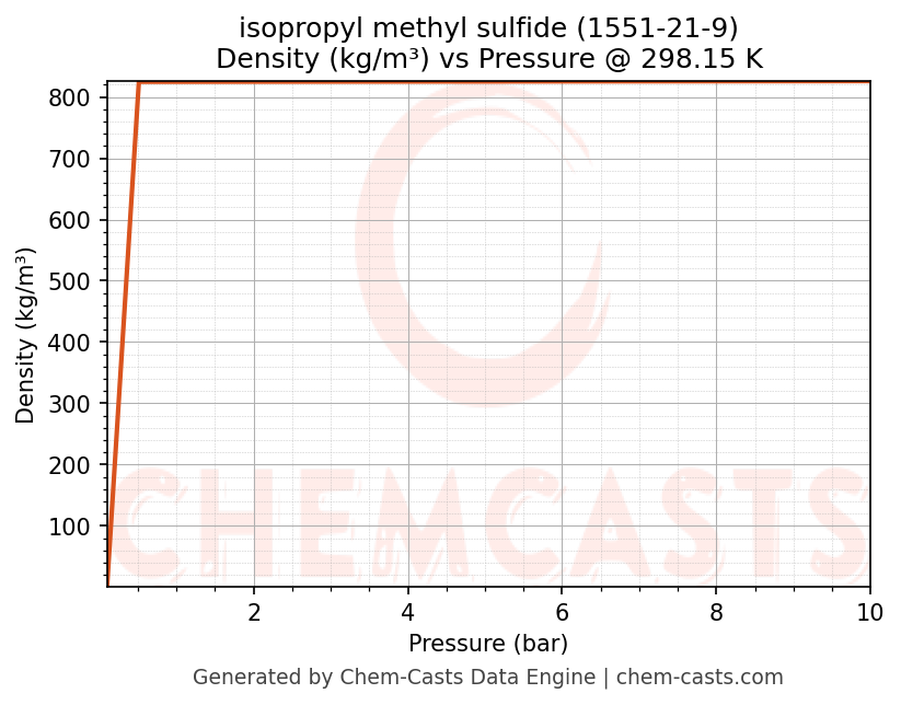 This page presents the pressure-dependent thermodynamic and transport properties of isopropyl methyl sulfide (CAS 1551-21-9) calculated at a constant temperature of 298 K (25 °C) over the pressure range 0.10-10 bar.