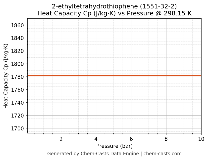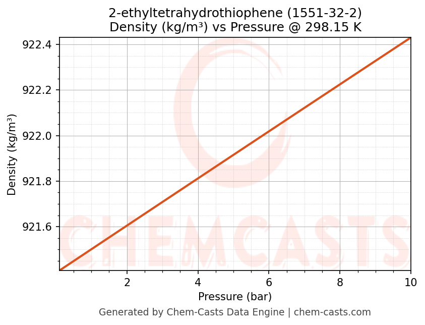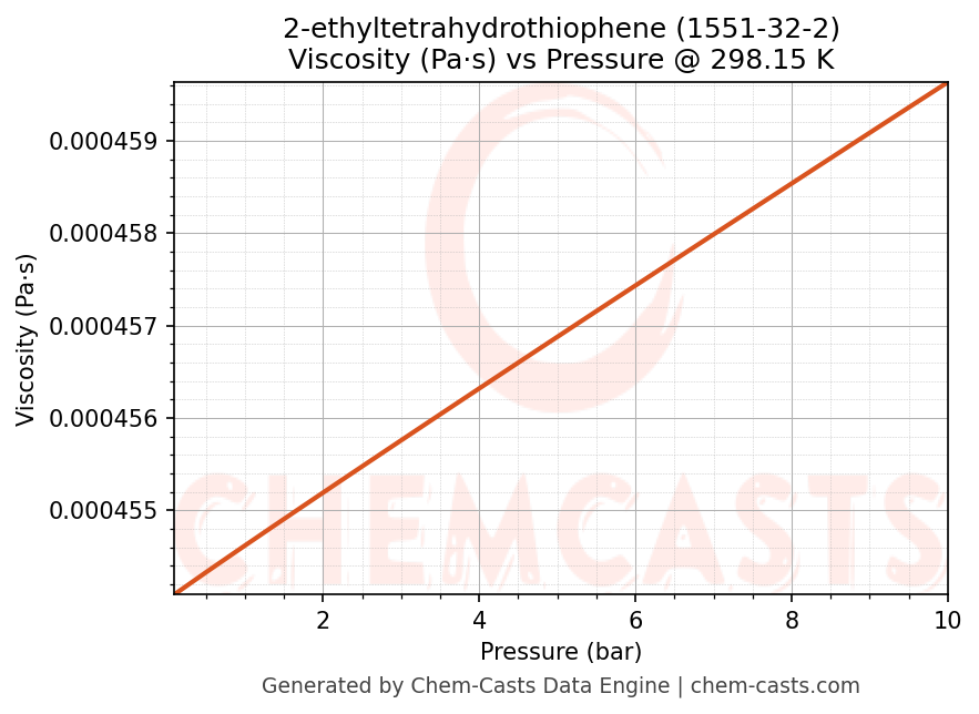 This page presents the pressure-dependent thermodynamic and transport properties of 2-ethyltetrahydrothiophene (CAS 1551-32-2) calculated at a constant temperature of 298 K (25 °C) over the pressure range 0.10-10 bar.