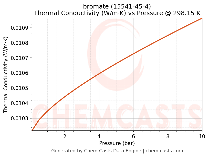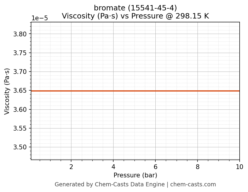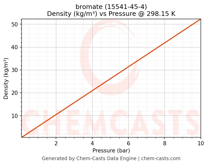 This page presents the pressure-dependent thermodynamic and transport properties of bromate (CAS 15541-45-4) calculated at a constant temperature of 298 K (25 °C) over the pressure range 0.10-10 bar.