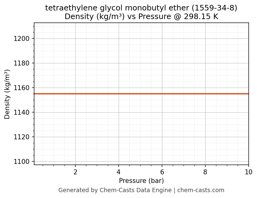This page presents the pressure-dependent thermodynamic and transport properties of tetraethylene glycol monobutyl ether (CAS 1559-34-8) calculated at a constant temperature of 298 K (25 °C) over the pressure range 0.10-10 bar.